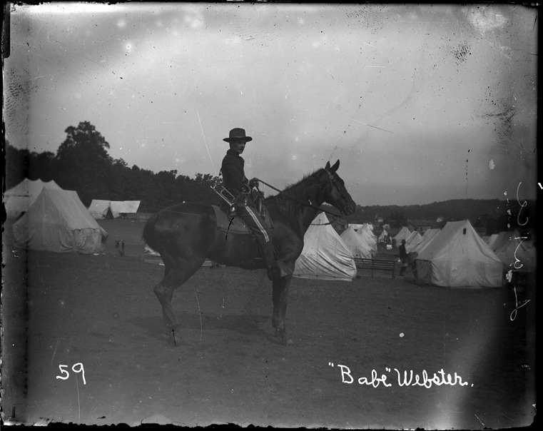 Favorite this☆ Soldier on horseback Description: Soldier on horseback carries a bugle; rows of tents in background; camp located at Knoxville, Tennessee. Written on image: "Babe Webster." Recorded in ledger: "Babe C.M. Webster, as a mounted bugler." Details Resource ID: SPAW044 Creator: Lake, Alma Subject: Spanish-American War, 1898 Soldiers--Michigan Horses--Tennessee--Knoxville Military camps--Tennessee--Knoxville Photographers--Michigan Glass negatives Date Issued: 1898 to 1899 Format: 1 negative : glass ; 4 x 5 in. Member of: Burton Historical Collection Negative Number: SPAW glass neg. no. 59 Rights: Physical rights are retained by DPL. Copyright is retained in accordance with U.S. copyright laws.