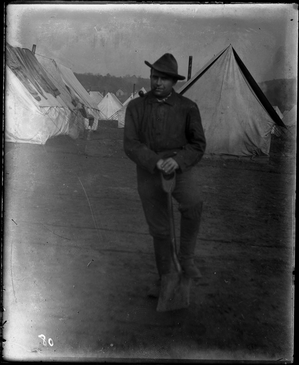 Favorite this☆ Portrait of Arthur P. Schroeder Description: Soldier stands with shovel in front of tents; camp located in Knoxville, Tennessee. Recorded in ledger: "Pvt. Arthur P. Schroeder, Co. L. 31st Mich., U.S.V.I." Details Resource ID: SPAW049 Creator: Lake, Alma Subject: Spanish-American War, 1898 United States. Army. Michigan Infantry Regiment, 31st (1898-1899) Military camps--Tennessee--Knoxville Soldiers--Michigan Photographers--Michigan Glass negatives Date Issued: 1898 to 1899 Format: 1 negative : glass ; 5 x 4.25 in. Member of: Burton Historical Collection Negative Number: SPAW glass neg. no. 80 Rights: Physical rights are retained by DPL. Copyright is retained in accordance with U.S. copyright laws.