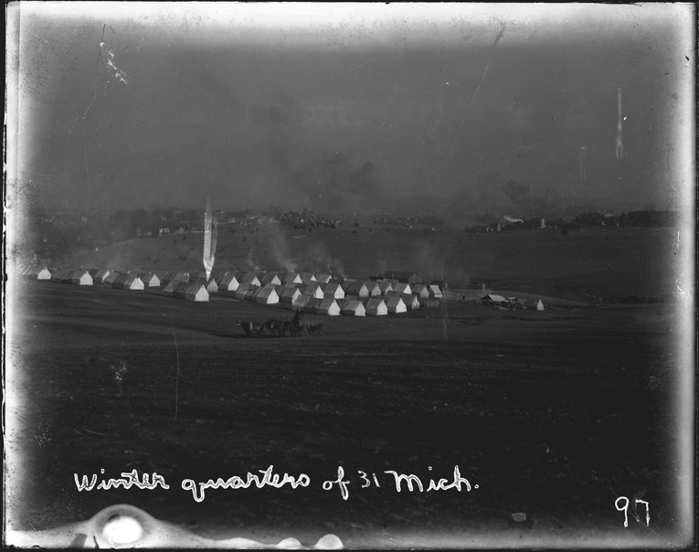 Favorite this☆ Camp in Knoxville, Tennessee Description: Distant view of rows of tents in a field; wagon pulled by team of mules. Written on image: "Winter quarters of 31 Mich." Recorded in ledger: "In winter quarters, camp of the 31st Mich. U.S.V.I. Knoxvill [sic] Tenn." Details Resource ID: SPAW062 Creator: Lake, Alma Subject: Spanish-American War, 1898 United States. Army. Michigan Infantry Regiment, 31st (1898-1899) Military camps--Tennessee--Knoxville Photographers--Michigan Glass negatives Date Issued: 1898 to 1899 Format: 1 negative : glass ; 4 x 5 in. Member of: Burton Historical Collection Negative Number: SPAW glass neg. no. 97 Rights: Physical rights are retained by DPL. Copyright is retained in accordance with U.S. copyright laws.