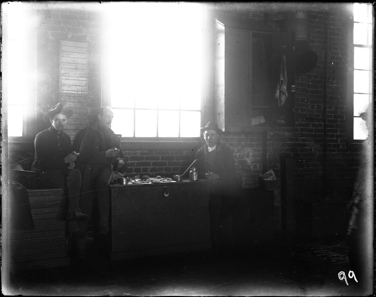Man wearing civilian clothing and two soldiers eat lunch in railroad roundhouse; dishes and food on chest next to window. Recorded in ledger: "Lunch in round house of the Southern R.R. at Knoxvill [sic] Tenn."