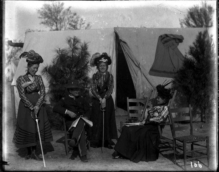 Favorite this☆ Soldier and three women at camp Description: Soldier poses outside tent with three women at camp at Savannah, Ga.; two women pose with swords; one woman sits in chair. Recorded in ledger: "Capt. Baxter's tent at Savannah, Ga., Miss Baxter, Capt. Baxter, a friend and Mrs. Baxter." Details Resource ID: SPAW071 Creator: Lake, Alma Subject: Spanish-American War, 1898 Military camps--Georgia--Savannah Soldiers--Michigan Photographers--Michigan Glass negatives Date Issued: 1898 to 1899 Format: 1 negative : glass ; 4 x 5.25 in. Member of: Burton Historical Collection Negative Number: SPAW glass neg. no. 106 Rights: Physical rights are retained by DPL. Copyright is retained in accordance with U.S. copyright laws.