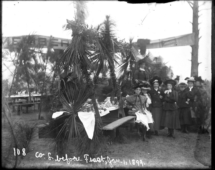 Group of women pose outdoors next to tables at camp decorated with palm fronds, vines and American flags; tables are set for a banquet or dinner; camp located at Savannah, Georgia. Written on image: "Co. L before feast, Jan. 1, 1899." Recorded in ledger: "Co. L's street, befor [sic] the feast, served by the ladies of Savannah, Ga. on Thursday Jan. 19th, 1899."