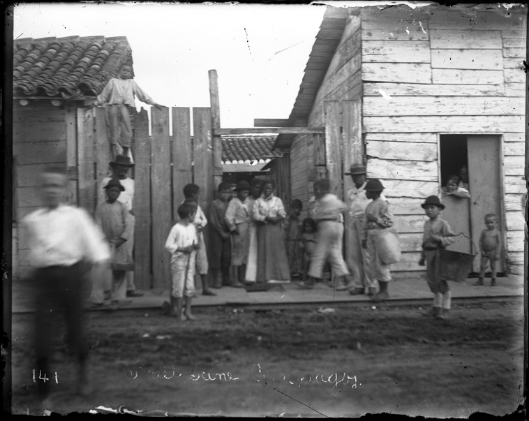 Group of men, women and children gather in front of wooden buildings with tile roofs; wooden fence and dirt road. Written on image: "Street scene, Cienfuegos." Recorded in ledger: "Street seen [sic] at Cienfuagos [sic] Cuba." Emulsion lifting from plate.