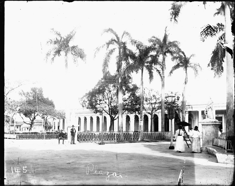 Favorite this☆ Plaza at Cienfuegos, Cuba Description: View of plaza in Cienfuegos, Cuba; building with colonnade; palm trees; wrought iron fences; two women walk near statue. Written on image: "Plaza." Recorded in ledger: "Plaza, Cienfuagos [sic] Cuba." Details Resource ID: SPAW081 Creator: Lake, Alma Subject: Spanish-American War, 1898 Plazas--Cuba--Cienfuegos Photographers--Michigan Glass negatives Date Issued: 1898 to 1899 Format: 1 negative : glass ; 4 x 5 in. Member of: Burton Historical Collection Negative Number: SPAW glass neg. no. 145 Rights: Physical rights are retained by DPL. Copyright is retained in accordance with U.S. copyright laws.