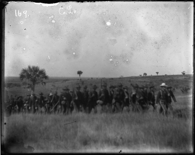 Favorite this☆ Soldiers marching in field Description: Line of soldiers marching in field; palmetto trees in distance. Written on image: "Co. L." Recorded in ledger: "Co. L 31st Mich. on the march to Amario [sic] Cuba, Sat. Feb. 18th, 1899." Details Resource ID: SPAW100 Creator: Lake, Alma Subject: Spanish-American War, 1898 United States. Army. Michigan Infantry Regiment, 31st (1898-1899) Soldiers--Michigan Photographers--Michigan Glass negatives Date Issued: 1899-02-18 Format: 1 negative : glass ; 4 x 5 in. Member of: Burton Historical Collection Negative Number: SPAW glass neg. no. 169 Rights: Physical rights are retained by DPL. Copyright is retained in accordance with U.S. copyright laws.