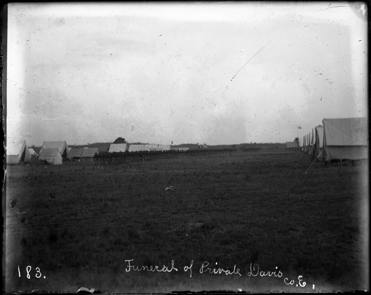 Favorite this☆ Military funeral at Amaro, Cuba Description: Line of soldiers march in formation with American flag at camp located at Amaro, Cuba; rows of tents. Written on image: "Funeral of Pvt. Davis Co. E." Recorded in ledger: "Funeral of Pvt. Davis Co. E 31st Mich. U.S.V.I. at Amaro, Cuba." Details Resource ID: SPAW114 Creator: Lake, Alma Subject: Spanish-American War, 1898 United States. Army. Michigan Infantry Regiment, 31st (1898-1899) Military funerals--Cuba Soldiers--Michigan Photographers--Michigan Glass negatives Date Issued: 1898 to 1899 Format: 1 negative : glass ; 4 x 5 in. Member of: Burton Historical Collection Negative Number: SPAW glass neg. no. 183 Rights: Physical rights are retained by DPL. Copyright is retained in accordance with U.S. copyright laws.