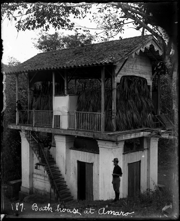 Soldier stands outside bathhouse in Amaro, Cuba; two-story wooden structure with tile roof; soldier stands on stairs leading to second level; second level has railing and walls constructed of palm fronds. Written on image: "Bath house at Amaro." Recorded in ledger: "Bath house at Amaro, Cuba, exterior."