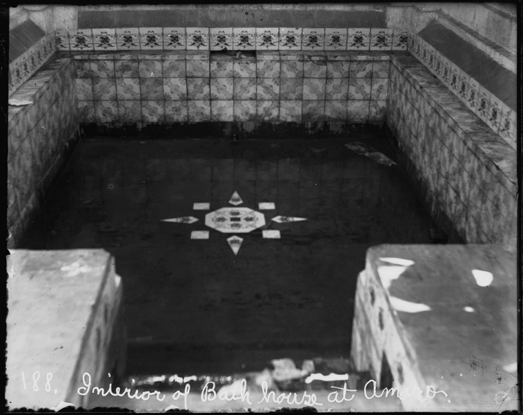 Favorite this☆ Interior of bathhouse at Amaro, Cuba Description: View of tiled sunken tub at bathhouse; tiles have decorative patterns. Written on image: "Interior of bath house at Amaro." Recorded in ledger: "Bath house at Amaro, Cuba, interior." Details Resource ID: SPAW119 Creator: Lake, Alma Subject: Spanish-American War, 1898 Bathhouses--Cuba Photographers--Michigan Glass negatives Date Issued: 1898 to 1899 Format: 1 negative : glass ; 4 x 5 in. Member of: Burton Historical Collection Negative Number: SPAW glass neg. no. 188 Rights: Physical rights are retained by DPL. Copyright is retained in accordance with U.S. copyright laws.