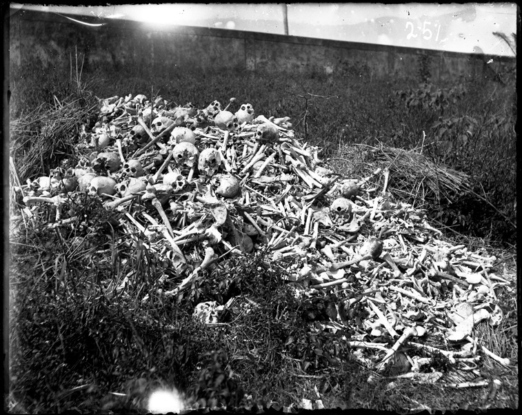 Favorite this☆ Bone pile in cemetery at Matanzas, Cuba Description: Pile of bones and skulls in cemetery field at Matanzas, Cuba. Recorded in ledger: "Cemetary [sic] at Matanzas, Cuba, bone pile." Details Resource ID: SPAW179 Creator: Lake, Alma Subject: Spanish-American War, 1898 Human remains (Archaeology)--Cuba--Matanzas Bones--Cuba--Matanzas Photographers--Michigan Glass negatives Date Issued: 1898 to 1899 Format: 1 negative : glass ; 4 x 5 in. Member of: Burton Historical Collection Negative Number: SPAW glass neg. no. 251 Rights: Physical rights are retained by DPL. Copyright is retained in accordance with U.S. copyright laws.
