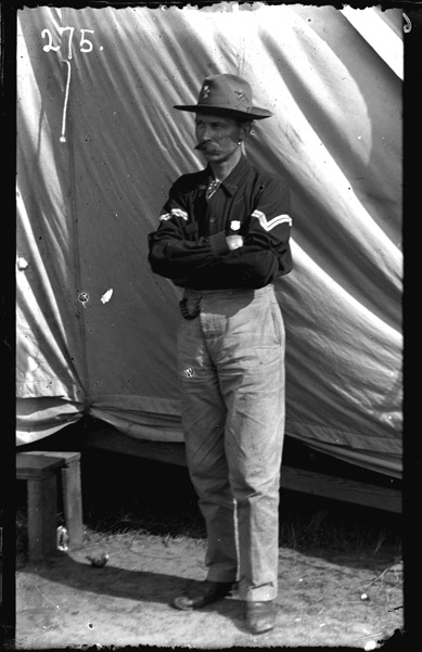 Favorite this☆ Portrait of Starr A. Voght Description: Soldier, with arms folded, poses outside of tent. Recorded in ledger: "Corp. Starr A. Voght, Co. L 31st Mich. U.S.V.I." Details Resource ID: SPAW205 Creator: Lake, Alma Subject: Spanish-American War, 1898 United States. Army. Michigan Infantry Regiment, 31st (1898-1899) Soldiers--Michigan Photographers--Michigan Glass negatives Date Issued: 1898 to 1899 Format: 1 negative : glass ; 4 x 2.75 in. Member of: Burton Historical Collection Negative Number: SPAW glass neg. no. 275 Rights: Physical rights are retained by DPL. Copyright is retained in accordance with U.S. copyright laws.