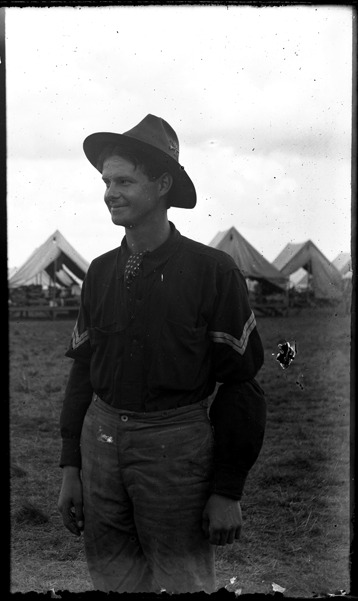 Soldier poses outdoors; tents in background. Recorded in ledger: "Corp. Kenneth I. Guest, Co. L 31st Mich. U.S.V.I."
