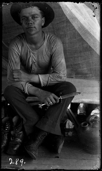 Favorite this☆ Portrait of John H. Freck Description: Seated soldier holding knife poses inside tent. Recorded in ledger: "Pvt. John H. Freck, Co. L 31st Mich. U.S.V.I." Details Resource ID: SPAW218 Creator: Lake, Alma Subject: Spanish-American War, 1898 United States. Army. Michigan Infantry Regiment, 31st (1898-1899) Soldiers--Michigan Photographers--Michigan Glass negatives Date Issued: 1898 to 1899 Format: 1 negative : glass ; 4 x 2.5 in. Member of: Burton Historical Collection Negative Number: SPAW glass neg. no. 289 Rights: Physical rights are retained by DPL. Copyright is retained in accordance with U.S. copyright laws.