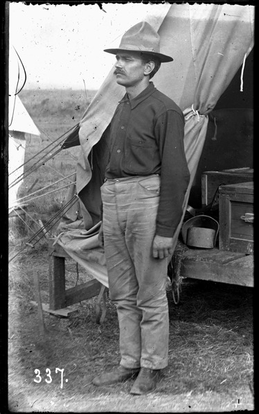Soldier poses in profile in front of tent. Recorded in ledger: "Pvt. Josia M. Case, Co. L 31st Mich. U.S.V.I."