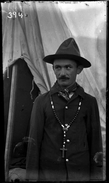 Soldier, wearing beaded necklace with cross, poses in front of tent. Recorded in ledger: "Pvt. Stephen Bohn, Co. L 31st Mich. U.S.V.I."