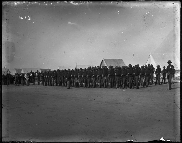 Favorite this☆ Soldiers in formation on Daufuskie Island Description: Soldiers with rifles stand in formation on Daufuskie Island; tents in background. Recorded in ledger: "Guard mount on the beach at DeFuskie [sic] Island." Details Resource ID: SPAW342 Creator: Lake, Alma Subject: Spanish-American War, 1898 Daufuskie Island (S.C.) Soldiers--Michigan Photographers--Michigan Glass negatives Date Issued: 1898 to 1899 Format: 1 negative : glass ; 4 x 5 in. Member of: Burton Historical Collection Negative Number: SPAW glass neg. no. 413 Rights: Physical rights are retained by DPL. Copyright is retained in accordance with U.S. copyright laws.