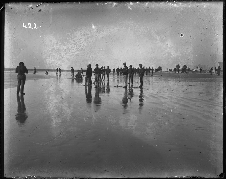 Group of soldiers stand on beach as tide comes in; several soldiers dig in sand; group of soldiers carrying rifles march in formation in background. Recorded in ledger: "Scenes on beach, DeFuskie [sic] Island."