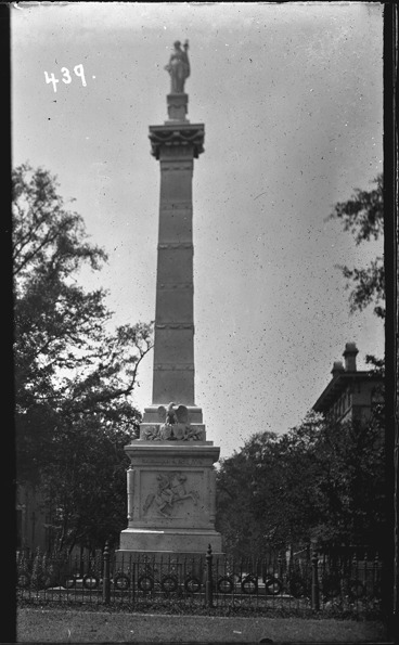 View of monument dedicated to Casimir Pulaski in Savannah, Georgia; columnar monument with statue of soldier at apex; bas-relief sculpture of soldier on horseback on base; inscribed on base: "Savannah 9 Oct. 1779." Recorded in ledger: "More mounements [sic]."