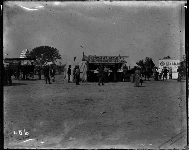 Group of soldiers stand in front of wooden booth in an open field; banner on booth: "Georgia & Alabama R'y, Southern Railway and Q & C R'y." Placard on canopy of nearby surrey reads: "Tickets sold here for Lansing, Mich." View of two men standing near display of prints; woman with umbrella; nearby tent advertises: "F.C and P.R.R., special train to Detroit via Asheville and Knoxville." Tents and horse-drawn vehicles in background. Recorded in ledger: "Where we bought our R.R. tickets for Detroit, Mich."