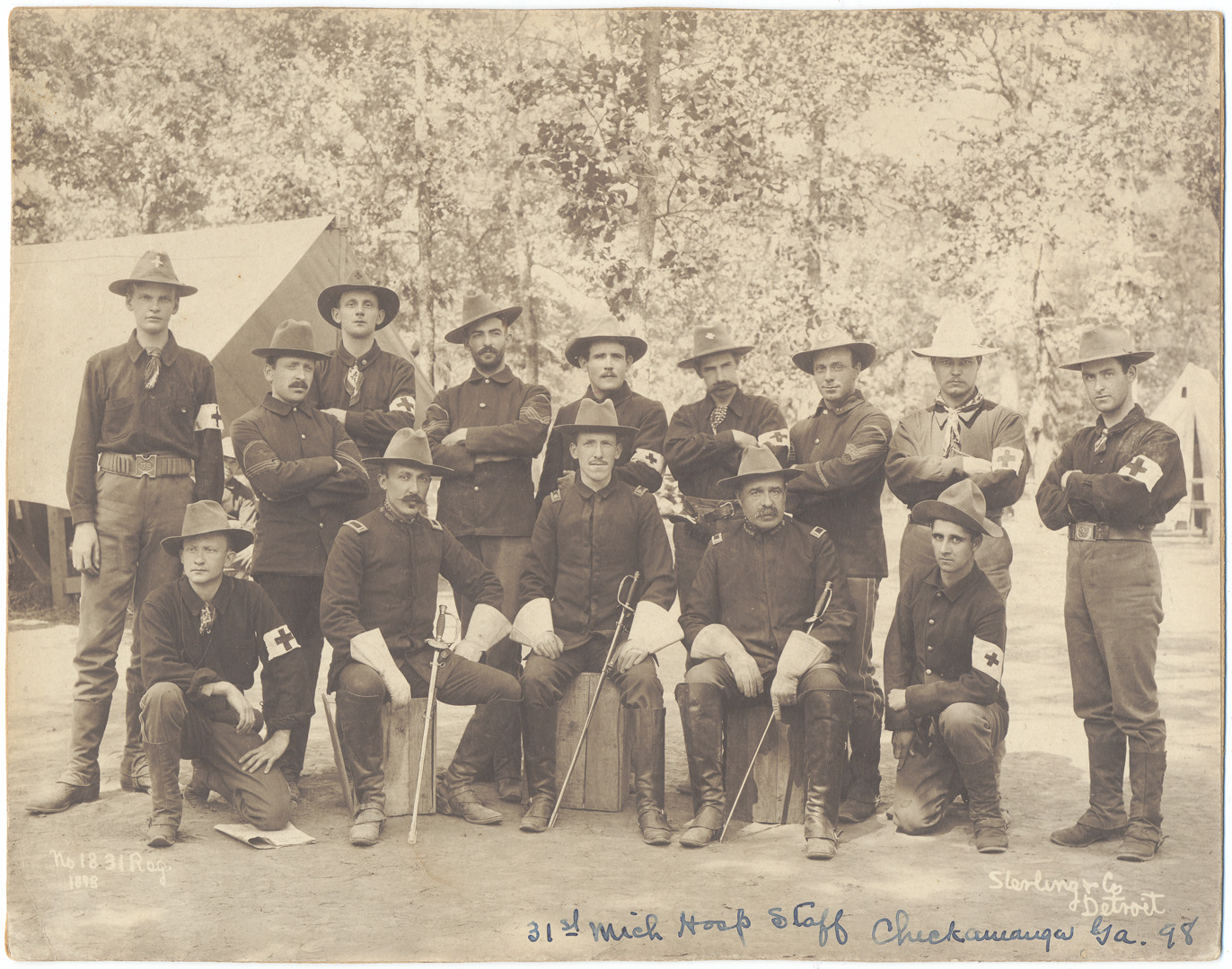 Two rows of seated and standing officers, some with swords, tent and woods behind them. Written on photo: "31st Mich. hosp. staff, Chickamauga, Ga., 98, Sterling & Co., Detroit, no. 18, 31 reg., 1898"